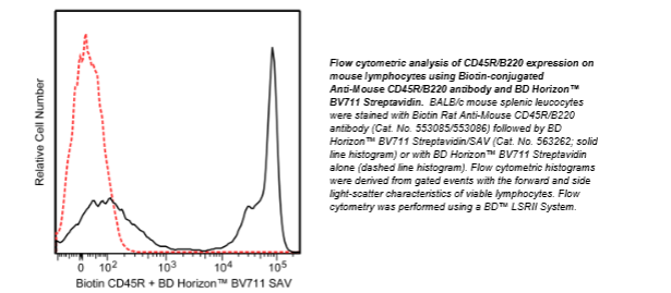 Streptavidin was conjugated to BD Horizon BV711 which is part of the BD Horizon Brilliant™ Violet family of dyes. This dye is a tandem