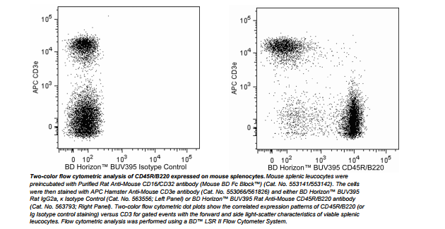 The rat anti-mouse CD45R antibody (clone RA3-6B2) has been reported to react with an epitope on the extracellular domain of the transmembrane CD45 glycoprotein which is dependent upon the expression of exon A and specific carbohydrate residues. It is expressed on B lymphocytes at all stages from pro-B through mature and activated B cell, but it is decreased on plasma cells and a subset of memory B cells. The levels of CD45R expression on the B-cell lineage appear to be developmentally regulated. It is also reportedly found on the abnormal T cells involved in the lymphadenopathy of lpr/lpr and gld/gld mutant mice, on lytically active subsets of lymphokine-activated killer cells (NK cells and non-MHC-restricted CTL), on apoptotic T lymphocytes of mice injected with bacterial superantigen, on a population of NK-cell precursors in the bone marrow, and on B-lymphocyte, T-lymphocyte, and macrophage progenitors in fetal liver. The CD45R antigen has been reported not to be on hematopoietic stem cells, naive T lymphocytes, or MHC-restricted CTL. CD45 is a member of the Protein Tyrosine Phosphatase (PTP) family: Its intracellular (COOH-terminal) region contains two PTP catalytic domains, and the extracellular region is highly variable due to alternative splicing of exons 4, 5, and 6 (designated A, B, and C, respectively), plus differing levels of glycosylation. The CD45 isoforms detected in the mouse are cell type-, maturation, and activation state-specific. The CD45 isoforms play complex roles in T-cell and B-cell antigen receptor signal transduction. CD45R is commonly used as a pan B-cell marker; however, CD19 expression, detectable by the rat anti-mouse CD19 antibody (clone 1D3), is reported to be more restricted to the B-cell lineage. The rat anti-mouse CD45R antibody (clone RA3-6B2) has been reported to enhance isotype switching during in vitro B-cell responses and to inhibit in vivo B-cell responses. Cross-reaction of the RA3-6B2 clone with activated human T lymphocytes has also been reportedly observed. The antibody was conjugated to BD Horizon™ BUV395 which has been exclusively developed by BD Biosciences as an optimal dye for use on a 355 nm laser equipped instrument. With an Ex Max at 348 nm and an Em Max at 395 nm, this dye has virtually no spillover into any other detector. BD Horizon™ BUV395 can be excited with a 355 nm laser and detected with a 379/28 filter.