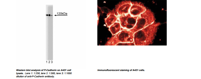 Cadherins are a family of transmembrane glycoproteins involved in the Ca2+-dependent cell-cell adhesion that occurs in many tissues. Cadherins are similar in their domain structure, Ca2+ and protease sensitivity, and molecular weight. However, these proteins have distinct tissue expression patterns and immunological reactivities. P-Cadherin is localized in placenta while E-Cadherin and N-Cadherin are found in epithelial and neural tissues, respectively. P-Cadherin is an 829 amino acid polypeptide with a putative signal peptide and precursor region, an extracellular domain containing several internal repeats, and a highly hydrophobic transmembrane region. The cytoplasmic domain provides a link to the cytoskeleton through the associated catenin proteins.