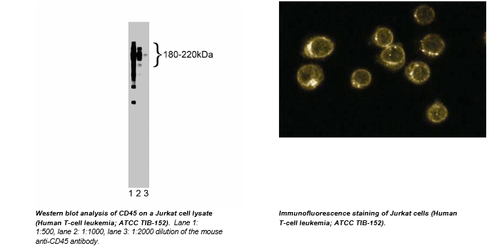 CD45 (also known as leukocyte common antigen, GP180, or T200) is found on all hematopoietic cells except those of red cell origin. The