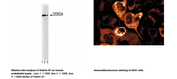 Kalinin is an epithelial cell laminin. It is a structural component of the dermal-epidermal junction of skin and basement membrane. The full molecule is composed of a 200 kDa A subunit, a 155 kDa B2 subunit, and a 140 kDa B1 subunit. Another B1k subunit with a predicted molecular weight of 126.9 kDa is encoded by a 3.9kb gene. The apparent molecular weight of Kalinin B1k is 140 kDa due to glycosylation. Its structure is divided into a long arm and a short arm domain that bind and crosslink with the other kalinin subunits.