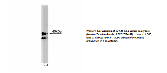 Apoptosis, a selective process of genetically programmed cell death, occurs during normal cellular differentiation and development of multicellular organisms. Apoptotic cells are characterized by loss of cell volume, plasma membrane blebbing, nuclear condensation, chromatin aggregation, and endonucleocytic degradation of DNA into nucleosomal fragments. Caspase-3 (CPP32, Yama, apopain) is the most extensively studied apoptotic protein. An apoptotic signal induces the intracellular cleavage of caspase-3 from an inactive proform to an active fragment. The active form of caspase-3 cleaves several other apoptotic proteins including DNA Fragmentation Factor (DFF). DFF is thought to be either directly or indirectly responsible for the DNA laddering that is a hallmark of apoptosis. It is a heterodimer of 40 kDa (DFF40) and 45 kDa (DFF45) subunits. Cleavage of DFF45 into three fragments is a prerequisite for DFF-mediated DNA fragmentation. Identity of the DFF fragment that mediates DNA laddering remains unclear. However, it is clear that DFF functions downstream of caspase-3 and is essential for the characteristic fragmentation of DNA during apoptosis.