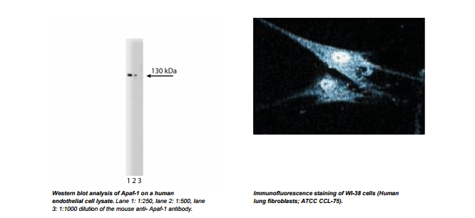 The process of apoptosis requires the activation of aspartate-specific cystenine proteases in the caspase family. Group I caspases (1,4,5) cleave at (W/L)EHD tetrapeptide motifs, while group II caspases (2,3,7) cleave the DEXD tetrapeptide motif. Group III caspases (6,8,9) are activators of other caspases via cleavage of (I/V)EXD tetrapeptide sequences. Apoptotic protease-activating factor-1 (Apaf-1), cytochrome c, and dATP activate caspase-9, which in turn, initiates the post-mitochondrial-mediated caspase cascade that includes caspase-2, 3, 6, 7, 8 and 10. Apaf-1 is a soluble protein with a short N-terminal caspase recruitment domain (CARD), a central CED-4 homology domain, and 12 WD-40 repeats that may be involved in protein-protein interactions. During apoptosis, a large (700 kDa) aposome complex containing Apaf-1, cytochrome c, caspase-3, 7, and 9, and a smaller (200-300 kDa) microaposome complex containing caspase-3 and 7 exhibit higher cleavage activity than "free" caspase heterotetramers. Thus Apaf-1 is a component of the large aposome complex, which functions in caspase activation leading to caspase-dependent proteolytic events and apoptosis.