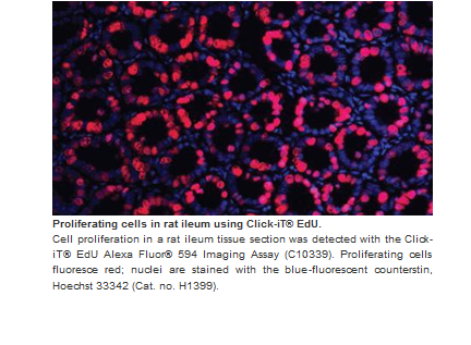 The Click-iT® EdU Alexa Fluor® 594 Imaging Kit provides a superior alternative to BrdU assays for measuring cell proliferation. EdU (5-ethynyl-2'-deoxyuridine) is a nucleoside analog of thymidine and is incorporated into DNA during active DNA synthesis. With Click-iT® EdU, mild fixation and detergent permeabilization is sufficient for the small molecule-based Click-iT® EdU detection reagent to gain access to the DNA. As a consequence, the Click-iT® EdU imaging kit is not only easy to use, but more accurate and compatible with cell cycle analysis and other intracellular or extracellular targets for truly content-rich results.