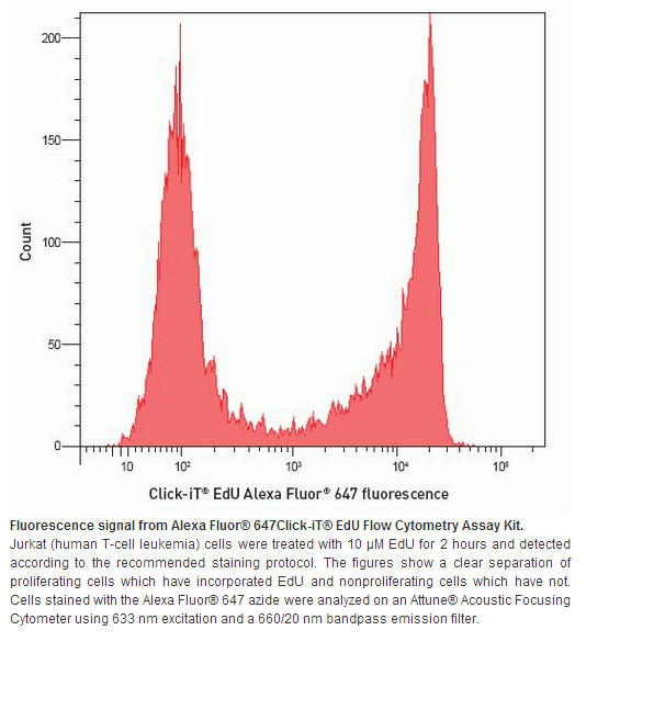The Click-iT® EdU Alexa Fluor® 647 Flow Cytometry Assay Kit provides a simplified, more robust assay for analyzing DNA replication in proliferating cells as compared to traditional BrdU methods. Newly synthesized DNA is analyzed using the 633/5 nm laser of the flow cytometer.