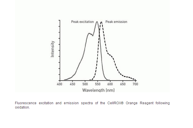 The CellROX™ Orange Detection Reagent is cell-permeable and non-fluorescent or very weakly fluorescent while in the reduced state. Upon oxidation, the reagent exhibits a strong fluorogenic signal that has absorption/emission maxima of 545/565 nm and remains localized in the cytoplasm. When used together with the included SYTOX™ Red Dead Cell Stain, oxidatively stressed and nonstressed cells are reliably distinguished from dead cells by flow cytometry.