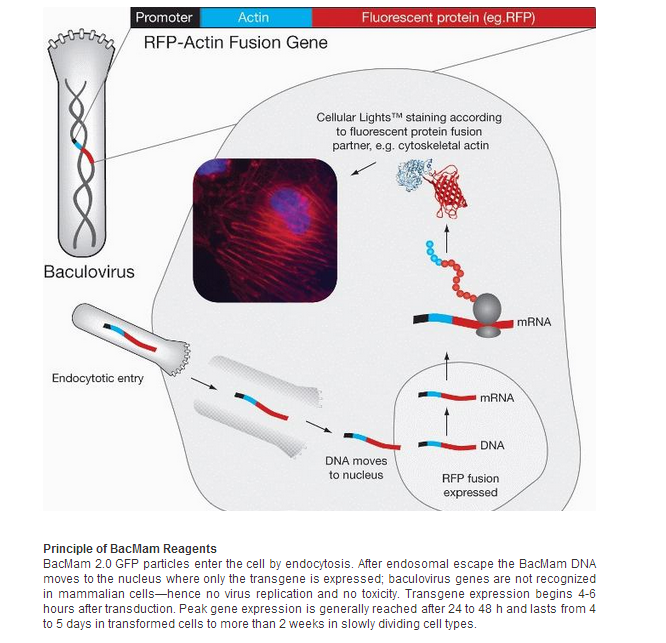 CellLight® Technology is: • Fast and convenient: simply add CellLight® reagent to your cells, incubate overnight, and image—or store frozen, assay-ready cells for later use • Highly efficient: up to 90% transduction of a wide range of mammalian cell lines, including primary cells, stem cells, and neurons • Flexible: co-transduce more than one BacMam reagent for multiplex experiments or co-localization studies; tightly control expression levels by simply varying the dose • Less toxic: CellLight® reagents are non-replicating in mammalian cells and are suitable for biosafety level (BSL) 1 handling