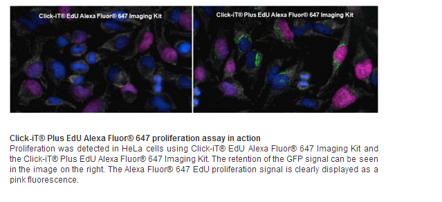 Click-iT® Plus EdU Alexa Fluor® imaging kits have been optimized for fluorescence microscopy applications and are a superior alternative to traditional proliferation assays. In this assay the modified thymidine analogue EdU (5-ethynyl-2'-deoxyuridine, a nucleoside analog of thymidine) is efficiently incorporated into newly synthesized DNA and fluorescently labeled with a bright, photostable Alexa Fluor® dye in a fast, highly-specific, mild click reaction.
