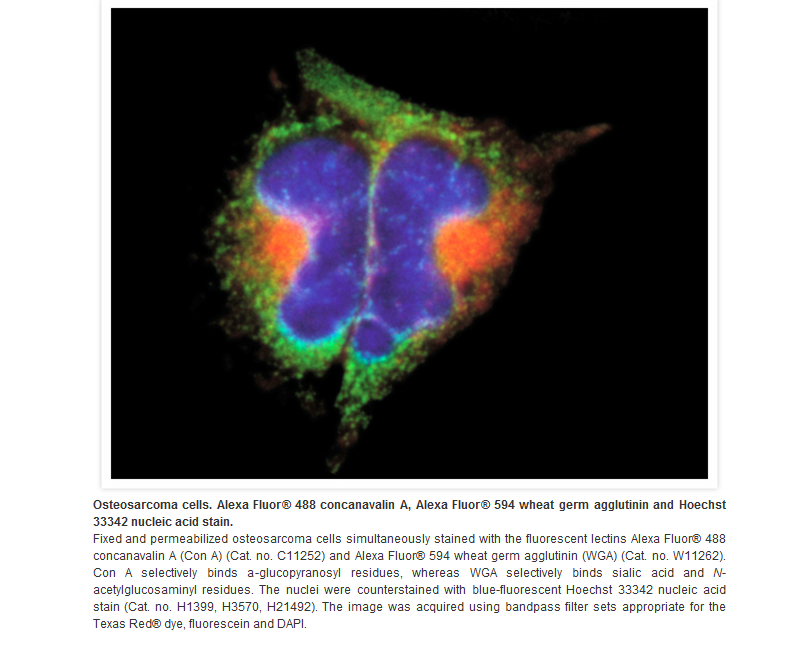 Concanavalin A (Con A) is one of the most widely used lectins in cell biology. Our Alexa Fluor® 488 conjugate of Con A exhibits the bright, green fluorescence of the Alexa Fluor® 488 dye (absorption/emission maxima ~495/519 nm). Alexa Fluor® 488 Con A selectively binds to a-mannopyranosyl and a-glucopyranosyl residues.