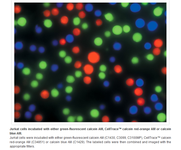 Calcein AM is a cell-permeant dye that can be used to determine cell viability in most eukaryotic cells. In live cells the nonfluorescent calcein AM is converted to green-fluorescent calcein, after acetoxymethyl ester hydrolysis by intracellular esterases. This dye is also available in our special packaging (C-3100) and resuspended in DMSO (C-3099). For a longer wavelength version of this dye check out our new CellTrace calcein red-orange AM (C-34851).
