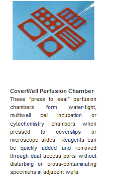 CoverWell perfusion chamber gaskets are designed to facilitate live-cell imaging and manipulation. These gaskets form watertight Φpress-to-sealΦ chambers with dual-access ports so reagents can be quickly added and removed. Available in single- or multi-well configurations, these gaskets allow multiple experiments to be performed on a single microscope slide or coverslip. The heat-resistant gaskets can be sterilized and used for direct culturing of cells and tissues.