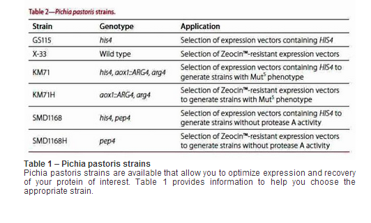 Several Pichia pastoris strains are available to allow you to optimize expression and recovery of your protein of interest. Table 1 provides information to help you choose the appropriate strain.