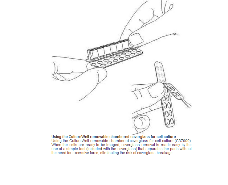 The CultureWell™ removable chambered coverglass for cell culture is ideal for cell culture and fluorescence imaging applications. The chambered coverglass—provided sterile and ready to use—contains 16 wells that can each hold up to 250 µL, allowing cells to be cultured in a number of different conditions on a single slide. When the cells are ready to be imaged, coverglass removal is made easy by the use of a simple tool (included) that separates the parts without the need for excessive force, eliminating the risk of coverglass breakage. Frosted microscope slides are also provided for mounting. <A sample size containing two chambered coverglasses and the removal tool is also available (C37005)>