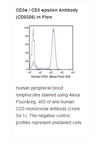 CD3 complex is crucial in transducing antigen-recognition signals into the cytoplasm of T cells and in regulating the cell surface expression of the TCR complex. T cell activation through the antigen receptor (TCR) involves the cytoplasmic tails of the CD3 subunits CD3 gamma, CD3 delta, CD3 epsilon and CD3 zeta. These CD3 subunits are structurally related members of the immunoglobulins super family encoded by closely linked genes on human chromosome 11. The CD3 components have long cytoplasmic tails that associate with cytoplasmic signal transduction molecules. This association is mediated at least in part by a double tyrosine-based motif present in a single copy in the CD3 subunits. CD3 may play a role in TCR-induced growth arrest, cell survival and proliferation. The CD3 antigen is present on 68-82% of normal peripheral blood lymphocytes, 65-85% of thymocytes and Purkinje cells in the cerebellum. It is never expressed on B or NK cells. Decreased percentages of T lymphocytes may be observed in some autoimmune diseases.