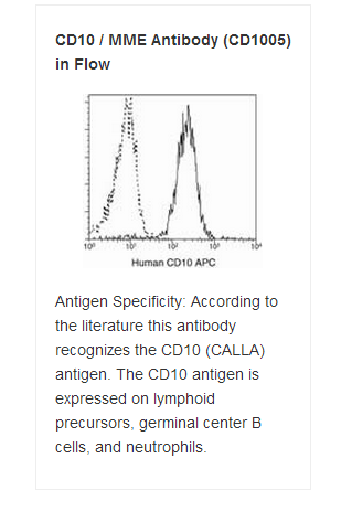 CD10 (neutral endopeptidase - NEP, common acute lymphocytic leukemia antigen - CALLA, membrane metallo-endopeptidase - MME, enkefalinase) is a 100-kDa cell surface zinc metalloprotease cleaving peptide bonds on the N-terminus of hydrophobic amino acids and inactivating multiple physiologically active peptids. CD10 is expressed on various normal cell types, including lymphoid precursor cells, germinal center B lymhocytes, and some epithelial cells, and its expression level serves as a marker for diagnostics of many carcinomas. CD10 is also a differentiation antigen for early B-lymphoid progenitors in the B-cell differentiation pathway and has a key role in regulation of growth, differentiation and signal transduction of many cellular systems.