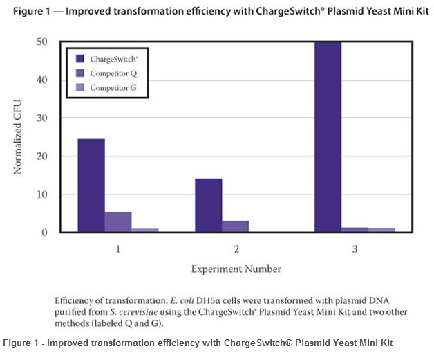 The ChargeSwitch® Plasmid Yeast Mini Kit provides an efficient method for purifying high-quality plasmid DNA from 1 ml of Saccharomyces cerevisiae grown in selective minimal media. This kit typically yields up to 25 ng of plasmid DNA. Data generated from transformation and PCR experiments using ChargeSwitch® purified DNA shows improved performance versus DNA purified by other methods (Figure 1). This kit includes all the necessary reagents for the number of preps listed and requires the use of a magnetic accessory. Please see the Accessories Chapter (Chapter 6) to select the best magnetic accessory for your needs.