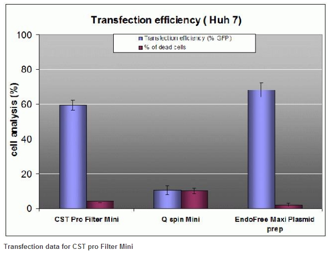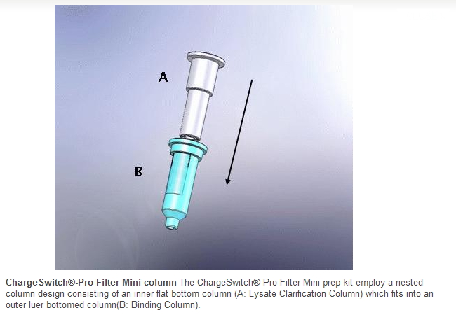 The ChargeSwitch®-Pro Plasmid Filter Mini, Midi, Maxi Kits generates high-quality plasmid DNA without the use of harsh or potentially interfering reagents, for better success in downstream applications. The system is based upon a novel dual⁄nested column design which facilitate the fastest and simplest protocol for high quality plasmid. The system is composed of two columns. The inner flat bottomed column, also referred to as “lysate clarification" column, contains filter materials suitable for rapid clarification of bacterial lysate. The outer luer bottomed column, also referred to as “binding" column, contains ChargeSwitch™ (CST) derivatized membrane that immediately binds plasmid DNA from the clarified lysate. This nested-column design enables simultaneous clarification and DNA binding in a single short centrifugation (or vacuum) step. The combined advantages of novel, optimized plastics and a unique chemistry are an extreme competitive advantage of speed and convenience.