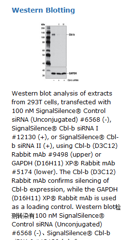 SignalSilence® Cbl-b siRNA II from Cell Signaling Technology (CST) allows the researcher to specifically inhibit Cbl-b expression using RNA interference, a method whereby gene expression can be selectively silenced through the delivery of double stranded RNA molecules into the cell. All SignalSilence® siRNA products from CST are rigorously tested in-house and have been shown to reduce target protein expression by western analysis.