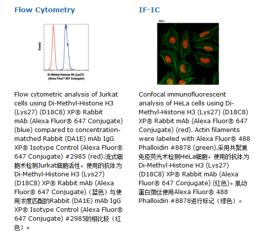 Di-Methyl-Histone H3 (Lys27) (D18C8) XP® Rabbit mAb (Alexa Fluor® 647 Conjugate) recognizes endogenous levels of histone H3 when di-methylated at Lys27. The antibody shows some cross-reactivity with mono-methylated Lys27, but does not cross-react with non-methylated or tri-methylated Lys27. In addition, the antibody does not cross-react with mono-methylated, di-methylated or tri-methylated histone H3 Lys4, Lys9, Lys36, or histone H4 Lys20.