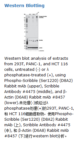 Phospho-Scribble (Ser1220) (D8A2) Rabbit mAb可以识别Ser1220被磷酸化的内源性scribble蛋白。单克隆抗体由合成肽段免疫动物产生,该肽段与人scribble蛋白Ser1220 附近氨基酸一致。Scribble(Scrib)最初是在果蝇中进行基因扫描时,和细胞极性决定蛋白Discs Large (Dlg) 和Lethal giant larvae (Lgl)一起发现的。将这些基因在果蝇体内进行纯和敲除会显示相似的表型,包括apicobasal细胞极性丢失以及肿瘤组织过度生长。这些相似的表型表示这三种蛋白在一个共同的通路中发挥重要作用以建立和维持表皮细胞中apicobasal的极性(1,2)。Scribble含有多个富含亮氨酸的重复以及PDZ结构域以将scribble定位到哺乳动物上皮细胞的黏附连接和基地外侧区域(3)。据报道,Scribble通过一个短基序和β-catenin, APC, E-cadherin 和高危型HPV病毒的E6蛋白结合,这种结合对E6蛋白诱导的细胞转化非常重要(4-8)。过表达scribble会通过HPV的E6/7蛋白抑制啮齿类上皮细胞转化(8).Scribble的磷酸化状态有重要功能,部分是通过调控亚细胞定位发挥的(9)。质谱分析显示Ser1220的磷酸化在多种细胞和组织类型中都是一个常见的修饰(10-13)。这个修饰的功能还有待阐明。