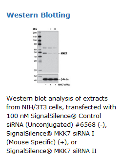 SignalSilence® MKK7 siRNA I (Mouse Specific) inhibits mouse and rat MKK7 expression.