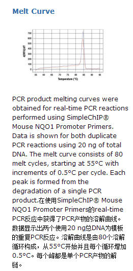 SimpleChIP® Mouse NQO1 Promoter Primers contain a mix of forward and reverse PCR primers that are specific to a region of the mouse NAD(P)H dehydrogenase quinone 1 promoter. These primers can be used to amplify DNA that has been isolated using chromatin immunoprecipitation (ChIP). Primers have been optimized for use in SYBR® Green quantitative real-time PCR and have been tested in conjunction with SimpleChIP® Enzymatic Chromatin IP Kits #9002 and #9003 and ChIP-validated antibodies from Cell Signaling Technology®. The NQO1 gene encodes a cytoplasmic 2-reductase which prevents formation of radical oxygen species.