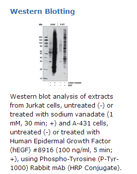 Phospho-Tyrosine (P-Tyr-1000) Rabbit mAb (HRP Conjugate) recognizes a broad range of tyrosine-phosphorylated proteins and peptides. This antibody does not cross-react with proteins or peptides containing phospho-Ser or phospho-Thr residues.