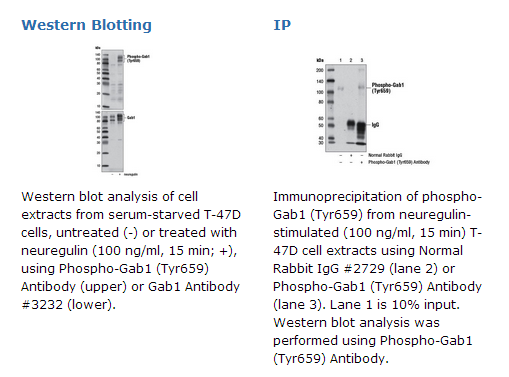 Phosho-Gab1 (Tyr659) Antibody recognizes endogenous levels of Gab1 protein only when phosphorylated at Tyr659.