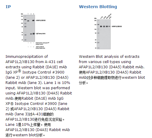 </p>AFAP1L2/XB130 (D4A5) Rabbit mAb可以识别内源性总的AFAP1L2/XB130蛋白。.</p>单克隆抗体由合成肽段免疫动物产生,该肽段与人AFAP1L2/XB130蛋白Val391附近氨基酸一致。</p>肌动蛋白丝相关蛋白(AFAP)家族包含有AFAP1,AFAP1L1和AFAP1L2/XB130,一组结构相似的蛋白在调控细胞骨架活性和信号转导过程中发挥了不同的作用。Actin filament-associated protein 1-like 2 (AFAP1L2, XB130)是一个调控多种疾病下游信号通路的接头蛋白,包括Src, Akt,和甲状腺特异性kinase RET/PTC(1-3)。通过这些信号通路,AFAP1L2/XB130介导了转录调控,细胞增殖,运动和microRNA表达(4,5)。研究显示AFAP1L2/XB130涉及了甲状腺肿瘤细胞的增殖和存活(6),还可能在胃癌预后过程中发挥作用(7)。