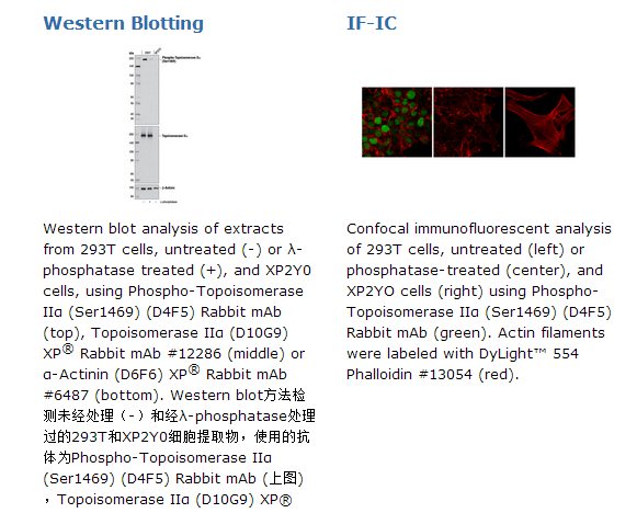 Phospho-Topoisomerase IIα (Ser1469) (D4F5) Rabbit mAb 能够检测内源性Ser1469位点磷酸化的topoisomerase IIα总蛋白。该单克隆抗体是采用合成的与人源topoisomerase IIα 蛋白的Ser1469残基周围序列相对应的肽段免疫动物而生产的。DNA拓扑异构酶I和II是核酶,并且type II是由两个高度同源的异构体:拓扑异构酶 IIα 和IIβ。这些酶可调控DNA的拓扑结构、维持基因组完整性,并且对于如DNA复制、重组、转录和染色体分离等通过DNA双链穿越彼此而实现的过程是必需的(1)。拓扑异构酶I能使双螺旋DNA的一条单链产生切刻并重新结合,而拓扑异构酶 II可使双链DNA瞬时断裂和关闭 (2)。拓扑异构酶对不同应激是非常敏感的。酸性PH或氧化应激能使拓扑异构酶转变为DNA断裂核酸酶,从而引起基因组的不稳定性和细胞死亡。 DNA损伤拓扑异构酶靶点药物(e.g. etoposide)也能将拓扑异构酶转变成核酸酶,并且该酶通常被诱捕作为中间物,共价地结合到剪切的DNA链的5+末端。研究发现该中间物能导致基因组的不稳定性和细胞死亡,因此那些靶定拓扑异构酶的药剂是癌症化疗药物之后备受追捧的(3)。Ca2+调节拓扑异构酶 IIa Ser1106位点的磷酸化可调节该酶的活性和对靶药物的敏感性(4)。Casein kinase 2 (CK2)在Ser1469位点磷酸化DNA topoisomerase IIα以产生一个能够被有丝分裂特异性抗体MPM-2识别的位点 (5)。