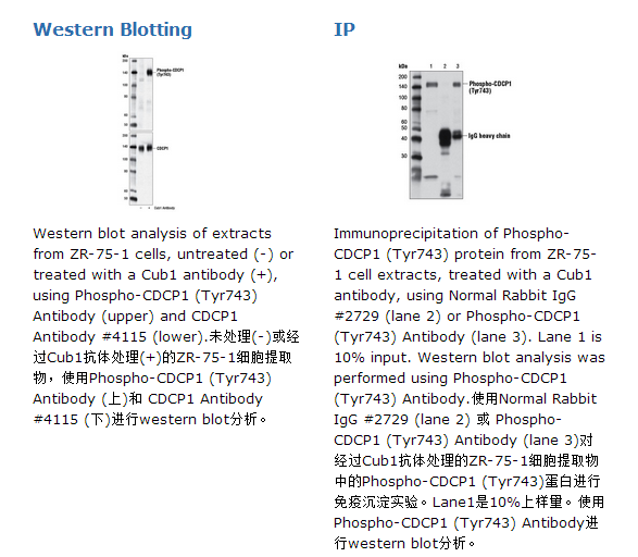 Phospho-CDCP1 (Tyr743) Antibody recognizes endogenous levels of CDCP1 protein only when phosphorylated at Tyr743. This antibody does not cross-react with CDCP1 phosphorylated at Tyr707, Tyr734, or Tyr806, but may cross-react with other phospho-tyrosine containing proteins.