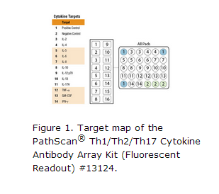 PathScan® Th1/Th2/Th17 Cytokine Antibody Array Kit (Fluorescent Readout) detects the target proteins as specified on the Array Target Map (figure 1). No significant cross reactivity has been observed between targets. This kit is optimized for cell culture supernatants. Recommended starting cell culture supernatant range is 20-75 μl. All antibodies have been validated for human-derived cell culture supernatants.