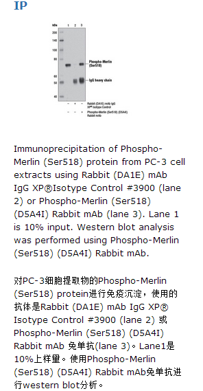 Phospho-Merlin (Ser518) (D5A4I) Rabbit mAb 兔单抗仅能识别Ser518磷酸化的内源性的merlin蛋白。该单克隆抗体由合成的人merlin蛋白Ser518位点附近肽段免疫动物而获得。神经纤维瘤病2(NF2)是一种常染色体显性遗传病,以前庭神经鞘瘤,脑膜瘤和其他神经系统肿瘤的发生为特点。NF2家族性肿瘤患者和人群中散发的肿瘤,都是由NF2肿瘤抑制基因的失活引起。Merlin (moesin, ezrin和radixin样蛋白)都是NF2基因的产物,与ezrin, radixin和moesin (ERM)有惊人的相似性。merlin (aka schwannomin) and ERM蛋白的调控涉及家族成员中分子内部及分子间的头尾关系(1)。Merlin和ERM蛋白的功能是作为细胞膜和细胞骨架之间的连接,影响细胞的形态,极性和信号转导(2)。Rac/Cdc42的效应器p21激活的激酶(PAK)可以磷酸化Merlin的Ser518,负向调节Rac(3,4)。