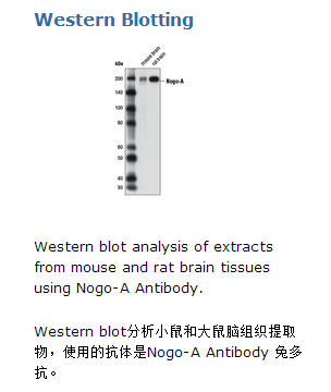 Nogo-A Antibody recognizes endogenous levels of total Nogo-A protein. Based on sequence homology, this antibody is not expected to recognize Nogo-B or Nogo-C.