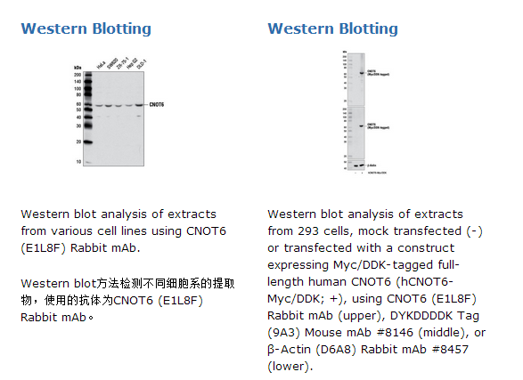 CNOT6 (E1L8F) Rabbit mAb能够检测内源性的CNOT6总蛋白水平。该单克隆抗体是用围绕人CNOT6 蛋白Gly400位点的氨基酸序列合成的多肽免疫动物而生产的。进化保守的CCR4-NOT (CNOT) 复合物能够调控真核细胞中的mRNA代谢(1)。这种调控作用发生在mRNA合成和降解的不同水平,包括转录起始,延伸,去乙酰化以及降解(1)。已经鉴定出了该复合物中存在的多种组分包括CNOT1, CNOT2, CNOT3, CNOT4, CNOT6, CNOT7, CNOT8, CNOT9, 以及CNOT10(2)。另外,该复合物的亚基组成在不同的组织中是各异的(3)。不同的CNOT蛋白可与CNOT6, CNOT6L, CNOT7 和CNOT8一起呈现出3'-5' RNAse活性,执行不同的功能(2,4)。研究表明,CCR4-NOT deadenylase 亚基CNOT6 和 CNOT6L能够介导细胞存活并在细胞增殖,P-body形成以及基因表达调控中具有重要作用(5)。此外还有研究证据表明,CNOT6能够作为核激素受体共激活因子与ZNF335 (NIF-1)一起调控特定的RARα 调控的基因的表达(6).