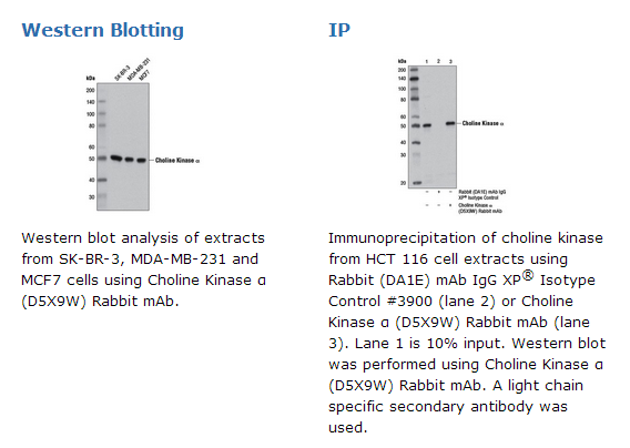 Choline Kinase α (D5X9W) Rabbit mAb recognizes endogenous levels of total choline kinase α protein. Based on the antigen sequence, this antibody is not expected to recognize choline kinase β.
