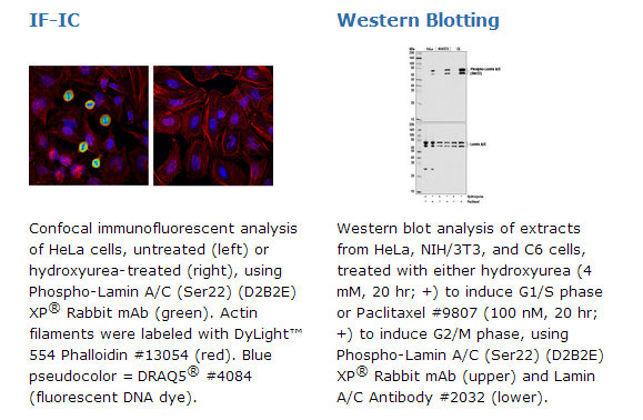 Phospho-Lamin A/C (Ser22) (D2B2E) XP® Rabbit mAb recognizes endogenous levels of lamin A/C protein only when phosphorylated at Ser22.