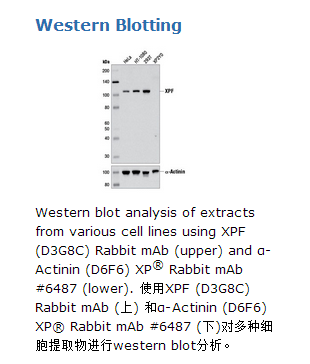 XPF (D3G8C) Rabbit mAb可以识别内源性XPF (ERCC4)总蛋白。单克隆抗体由合成肽段免疫动物产生,该肽段与人XPF (ERCC4)蛋白Arg670附近氨基酸一致。所有活细胞都有DNA损伤修复功能以调控DNA损伤。核苷酸切除修复(NER)出现在大片段的螺旋-扭曲损伤时,例如由UV或某种化学物质引发的损伤(1)。Excision Repair Cross Complementing 1 (ERCC1)与XPF构成复合物,作为5’内切酶切除掉发生损伤的部位(2)。ERCC1-XPF还在DNA链间交联(ICLs)(3)和双链损伤时(4)发挥足以。研究证明ERCC1的表达与存活率相关,也在一些人类癌症疾病,包括肺小细胞癌(NSCLC)对化疗的的反应过程相关(5,6)。