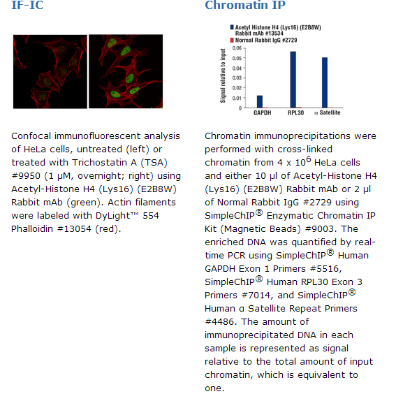 Acetyl-Histone H4 (Lys16) (E2B8W) Rabbit mAb recognizes endogenous levels of histone H4 protein only when acetylated at Lys16. This antibody does not cross-react with other acetylated histone proteins.