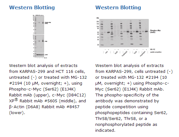 Phospho-c-Myc (Ser62) (E1J4K) Rabbit mAb recognizes endogenous levels of c-Myc protein only when phosphorylated at Ser62. This antibody may not recognize c-Myc phosphorylated at Ser62 when Thr58 is also phosphorylated.