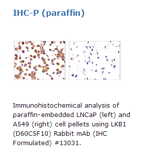 Each control slide contains formalin fixed, paraffin-embedded cell pellets, LNCaP (LKB1 positive) and A549 (LKB1 negative), that serve as a control for LKB1 immunostaining.