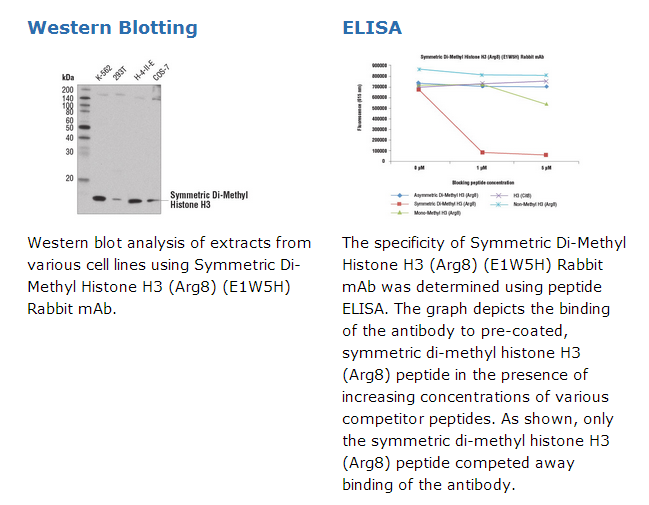 Symmetric Di-Methyl Histone H3 (Arg8) (E1W5H) Rabbit mAb recognizes endogenous levels of histone H3 protein only when symmetrically di-methylated at Arg8. This antibody may have a slight cross reactivity towards histone H3 protein when mono-methylated at Arg8.