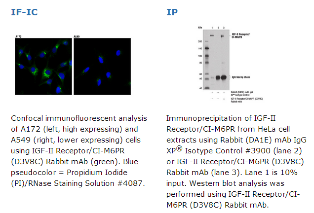 IGF-II Receptor/CI-M6PR (D3V8C) Rabbit mAb recognizes endogenous levels of total IGF-II Receptor/CI-M6PR protein.