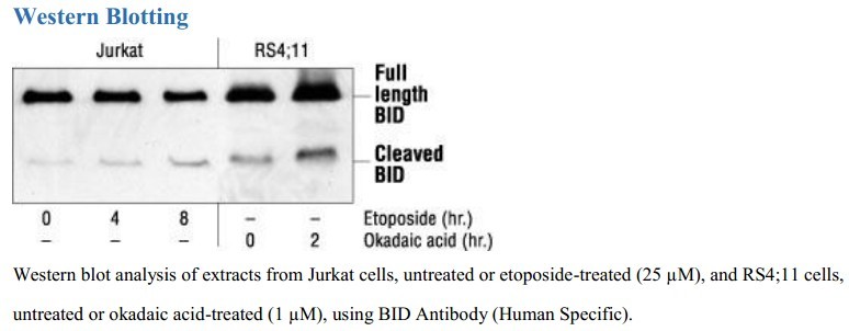 BID Antibody (Human Specific) detects endogenous levels of both the full length (22 kDa) and cleaved large fragment (15 kDa) of human BID.