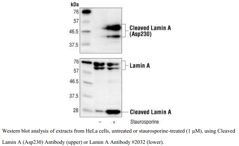 Cleaved Lamin A (Asp230) Antibody 能够检测内源的Asp230位点酶切的lamin A(和C 蛋白)的大片段。此抗体不与全长lamins A发生交叉反应。该多克隆抗体是采用合成的人源lamin A/C蛋白C末端Asp230周围残基相对应的肽段免疫动物而制备的。体由protein A和肽亲和层析技术纯化。