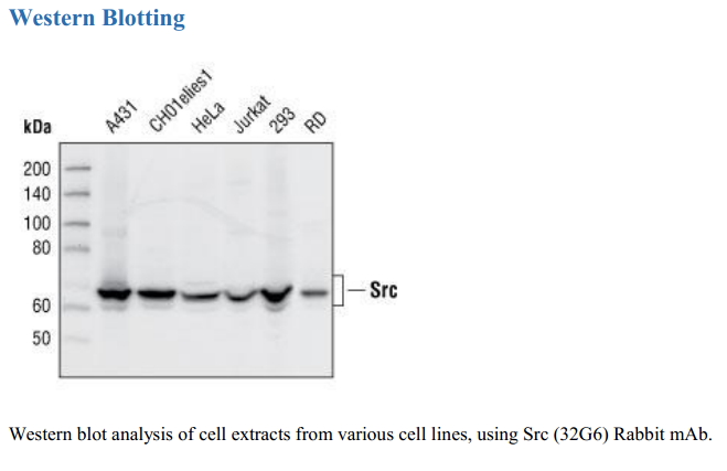 Src (32G6) Rabbit mAb兔单抗能够检测内源性Src总蛋白水平。该抗体不能与其他蛋白发生交叉反应。该单克隆抗体是采用与人源Src蛋白残基1-110相一致的重组融合蛋白免疫动物而产生的。