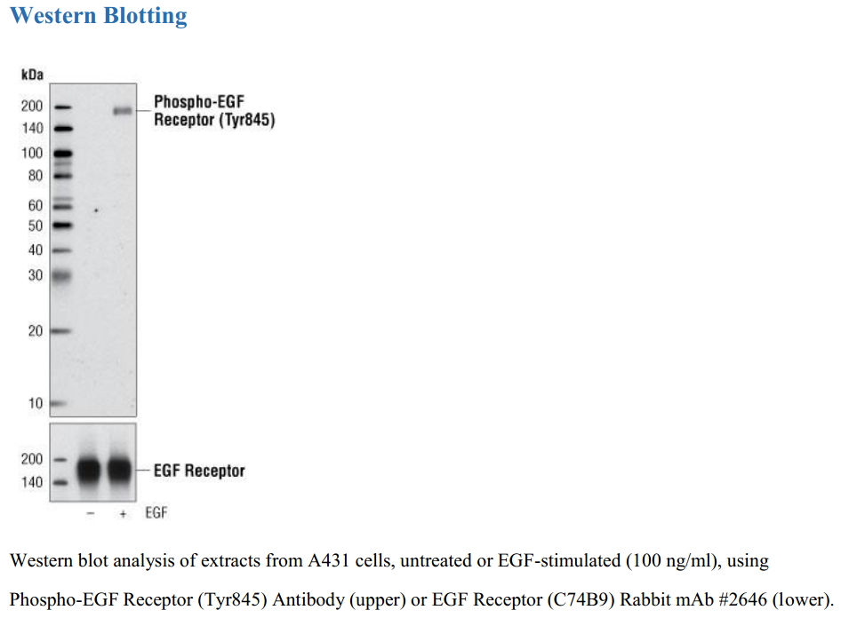 磷酸化的EGFR (Tyr845)的抗体仅在Tyr845被磷酸化后才能检测到内源EGFR的水平。本抗体可能与EGFR家族的其它蛋白发生交叉反应(如ErbB2)。克隆抗体通过用多肽免疫动物得到,该磷酸化多肽是根据人的EGFR蛋白Tyr845附近的氨基酸序列合成的。抗体经过protein A和亲和层析纯化。