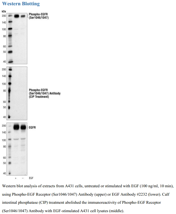 Phospho-EGF Receptor (Ser1046/1047) Antibody detects endogenous levels of EGF receptors only when phosphorylated at Ser1046/1047. This antibody may cross-react with other activated EGF receptor family members (e.g. ErbB2).