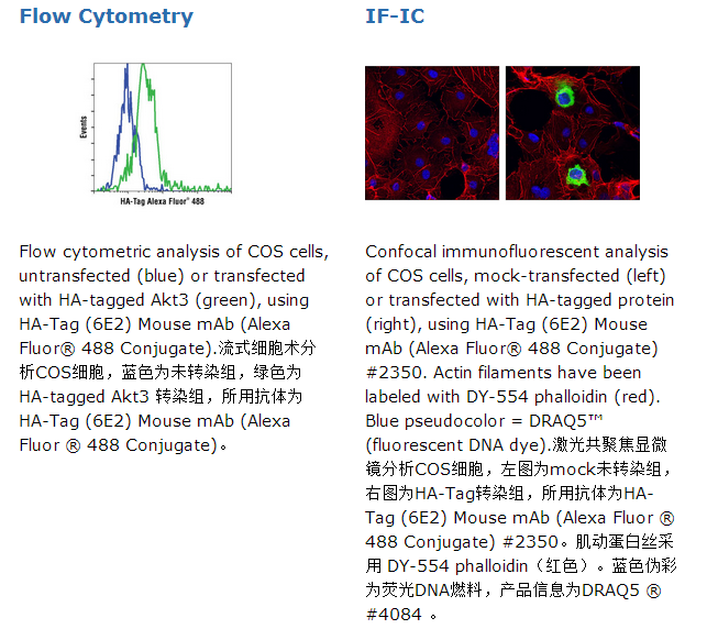 HA-Tag (6E2) Mouse mAb (Alexa Fluor® 488 Conjugate) detects proteins containing the HA epitope tag. The antibody recognizes the HA-tag fused to either the amino or carboxy terminus of targeted proteins in transfected mammalian cells.