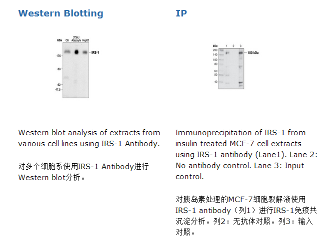 IRS-1 Antibody detects endogenous levels of total IRS-1. It does not cross-react with IRS-2, -3 or -4.